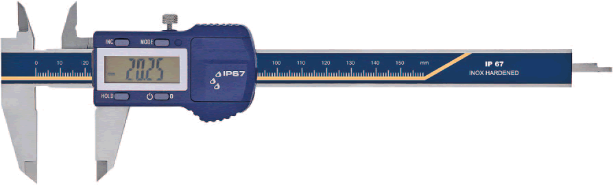 Digital-Messschieber IP 67 Messbereich 0 - 150 mm, mit rundem Tiefenmaß• induktives Messsystem• IP 67 Schutz, wasser- und staubdicht• aus rostfreiem Stahl, gehärtet• 4-fach Messung• mit mm/inch- und 0/ON/OFF-Taste• Ablesung 0,01 mm/0,0005“, umschaltbar• im Behältnis/Kasten