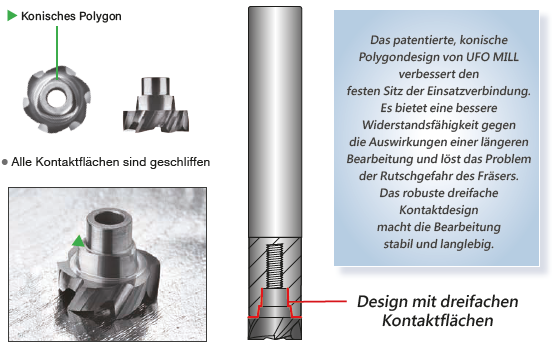 Mit dem UFO Mill Wechselkopfsystem sparen Sie Resourcen und Kosten. Durch den Einsatz wechselbarer Fräsköpfe mit kurzen Schneiden wird nur ein Bruchteil des Hartmetalls gegenüber Vollhartmetallwerkzeugen verwendet. Durch das patentierte Wechselsystem mit Polygon gibt keinerlei Einschränkungen hinsichltlich der Genauigkeit und Fräsleistung.