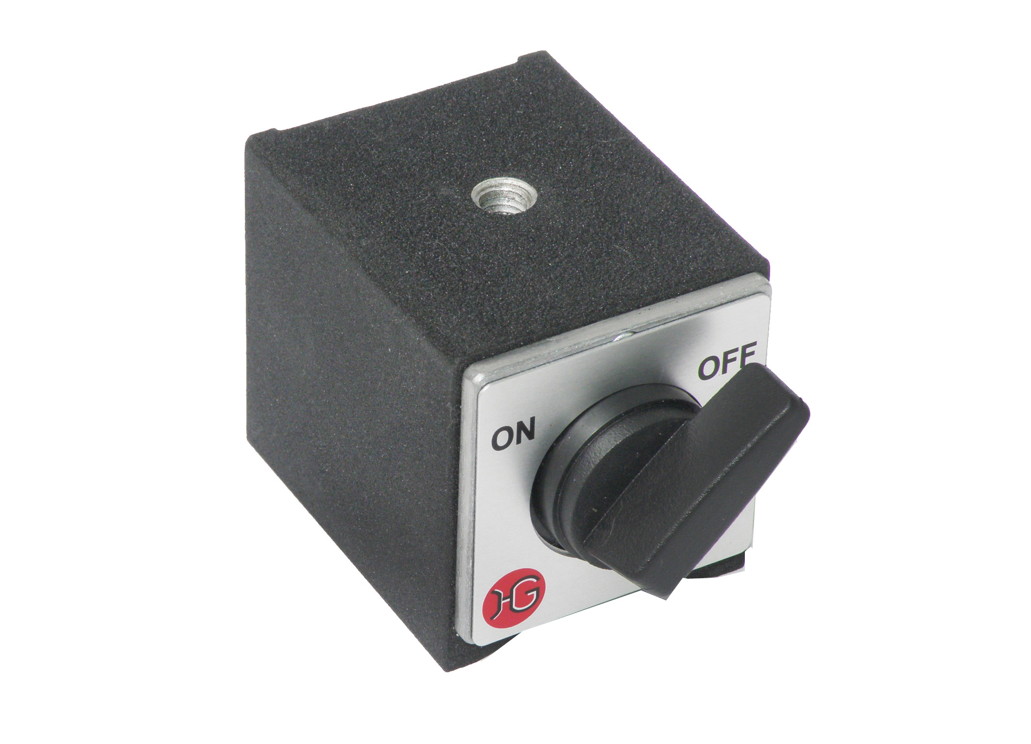 Schaltbarer Magnetfuß mit prismatischer Sohle. Gewinde mittig M8x1,25. Abmessung 60x50x55 mm. Haltekraft 800N.