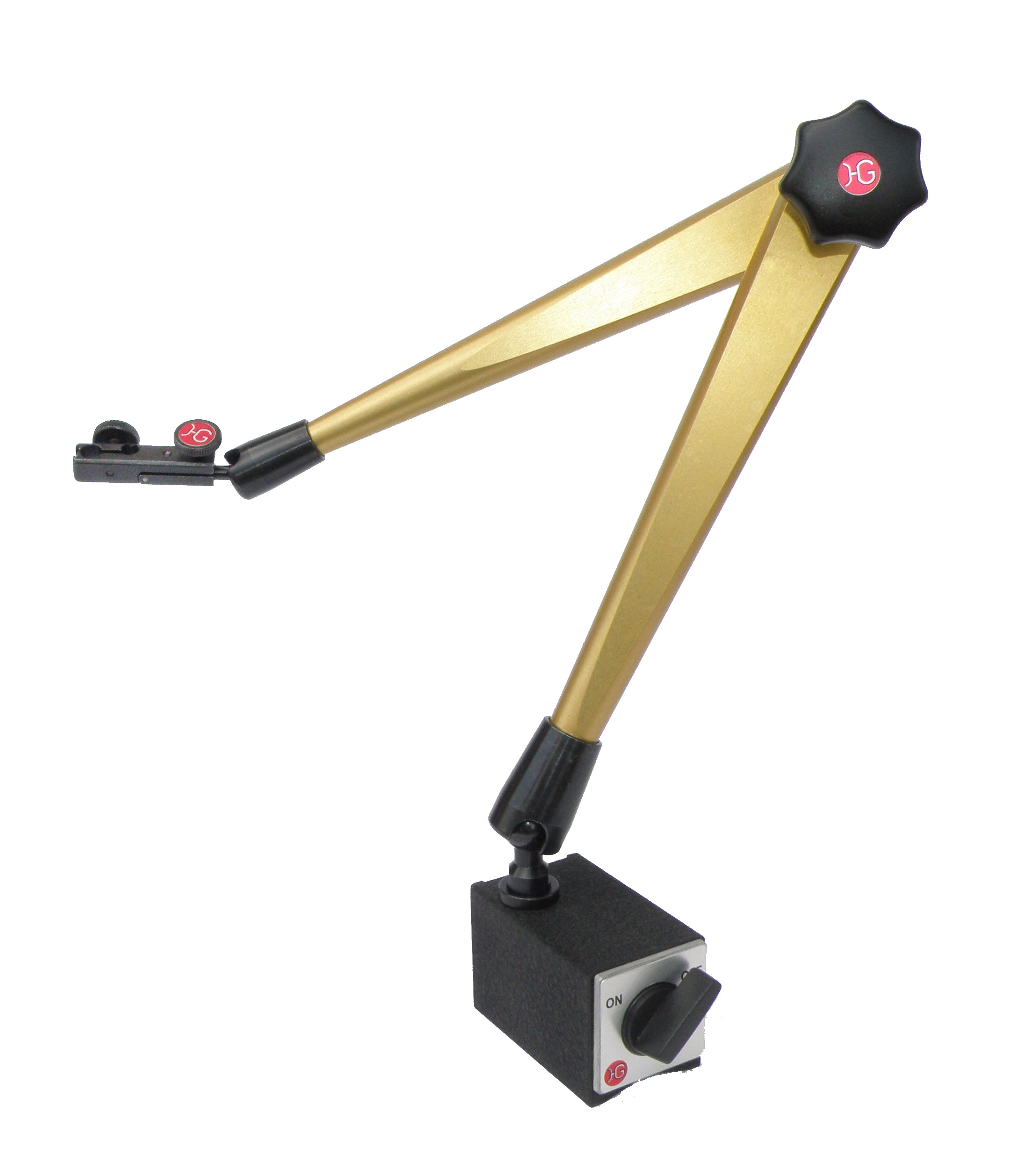 Original Hörger und Gässler Messstativ mit hydraulischer Klemmung. Gestängelänge 220 mm. Stativ bestehend aus Gestänge, Messschnabel (102072) und schaltbarem Magnetfuß Nr. 58 (60x50x55 mm) mit prismatischer Sohle. Goldfarben eloxiertes Aluminium. Die Klemmung der Gelenke bei den Hörger und Gässler Stativen erfolgt über ein Anziehen eines Sterngriffs. Dadurch wird im Inneren des goldfarben eloxierten Stativs ein raffiniertes Hydrauliksystem angestoßen, das jedes Gelenk mit höchster Starrheit klemmt. Der enorme Öldruck im Stativ garantiert beste Messergebnisse und absolut flüssige Spannvorgänge. Durch beste Oberflächengüten der Dichtflächen und hochwertigste Verarbeitung erreichen die Stative bei sachgemäßer Handhabung oft eine Lebensdauer von mehr als einer Generation.