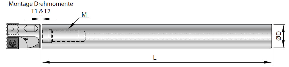 Einschraub-Verlängerungen aus Stahl M5 - T Bereich kennzeichnet die maximale Ausspannlänge- mit interner Kühlmittelbohrung T1 : Anzugsdrehmoment bis Kontaktfläche erreichtT2 : Anzugsdrehmoment zur sicheren Befestigung
