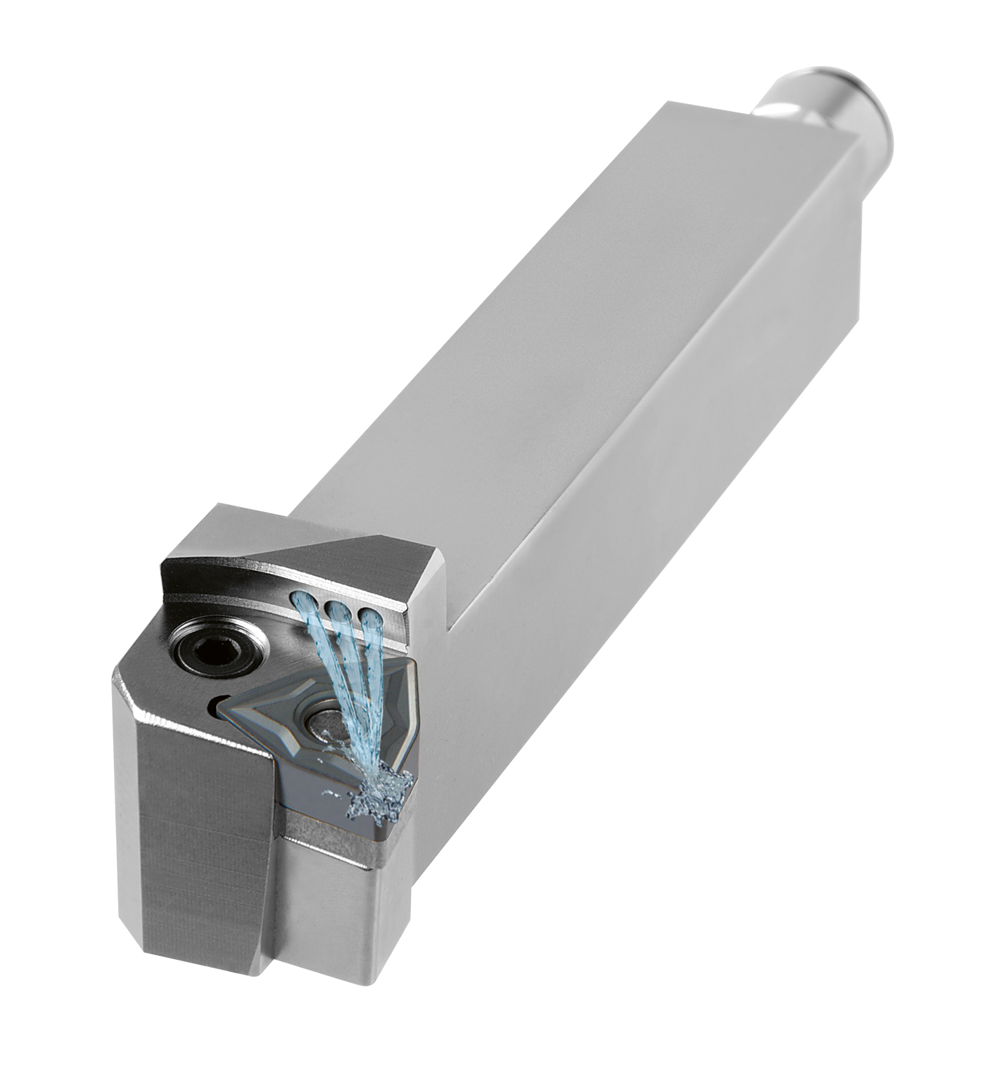 Drehhalter PWLNR/L Drehstahl für Wendeplatten WNMG0804 / WNMM0804 mit Innenkühlung direkt auf die Schneide. 3 verschiedene Kühlmittelanschlussmöglichkeiten G1/8, auch für direkte Kühlmittelübergabe aus VDI / BMT Halter geeignet. Abbildung zeigt Ausführung "rechts". Lieferung ohne Wendeschneidplatte und Schlauchanschluss.