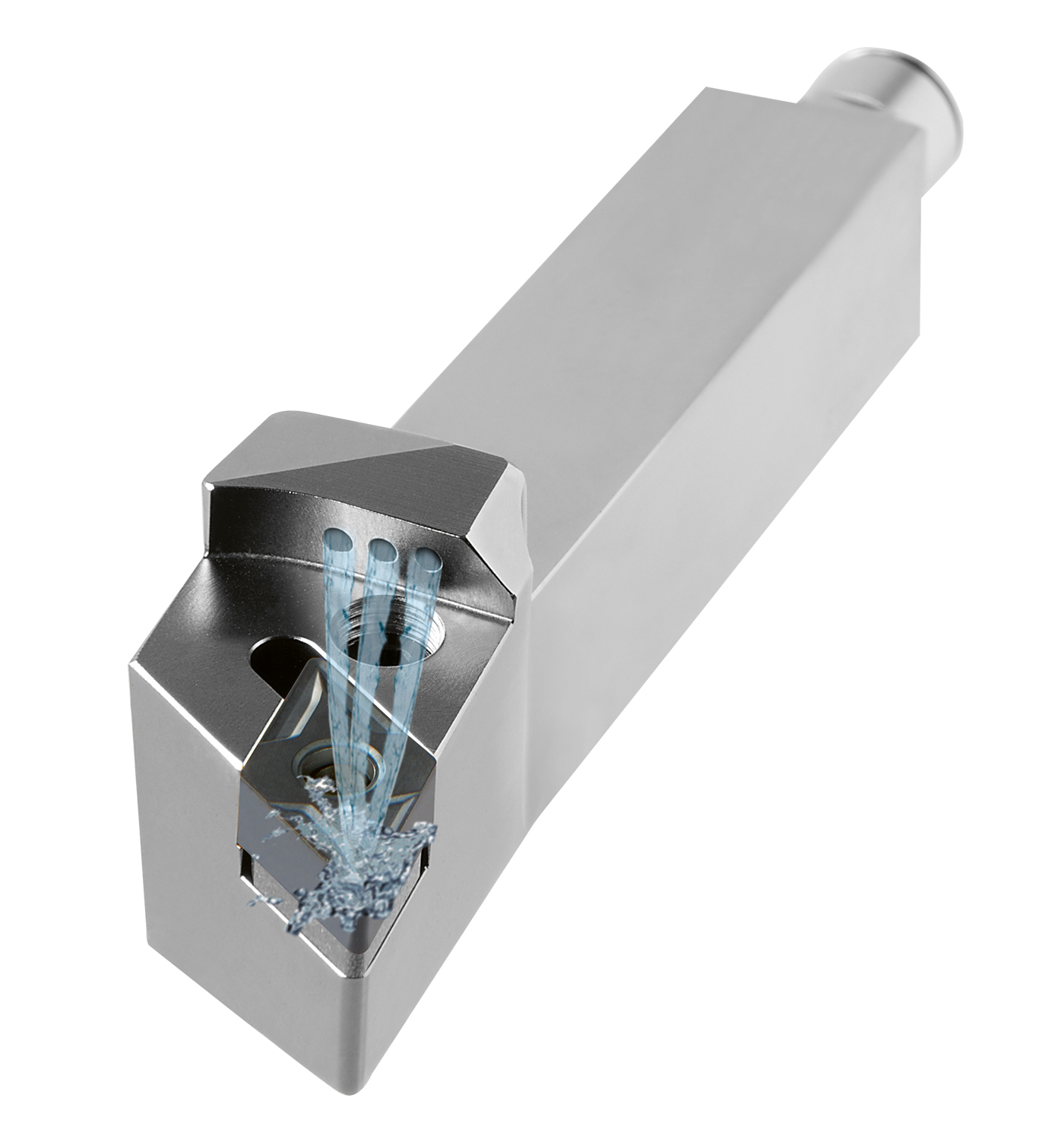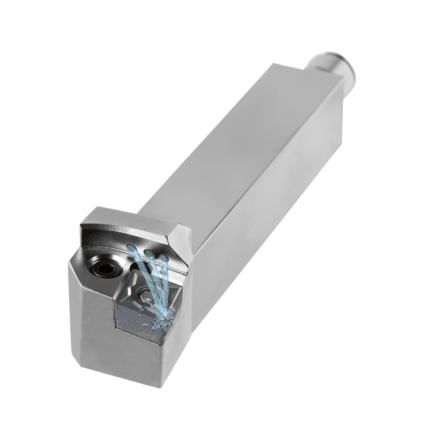 Drehhalter SCLCR/L Drehstahl für Wendeplatten CCMT09T3 (SCLCR/L1616 und 2020) / CCMT1204 (SCLCR/L2525) mit Innenkühlung direkt auf die Schneide. 3 verschiedene Kühlmittelanschlussmöglichkeiten G1/8, auch für direkte Übergabe aus VDI / BMT Halter geeignet. Abbildung zeigt Ausführung "rechts". Lieferung ohne Wendeschneidplatte und Schlauchanschluss.